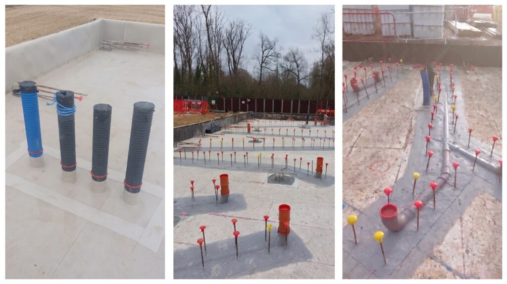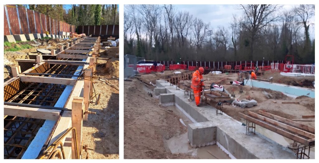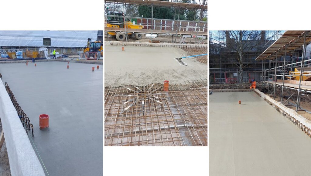 - The substructure for four new terraced buildings followed a precise multi-stage sequence, including piling mat management, pile cropping, and the construction of ground beams and RC rafts. The scope also covered the foundations, concrete slabs, and drainage required for the extensions to existing Blocks A and B. The wider infrastructure package was completed with site-wide utilities, a reinforced concrete substation base, and a sustainable drainage system (SuDS) featuring attenuation basins and swales.